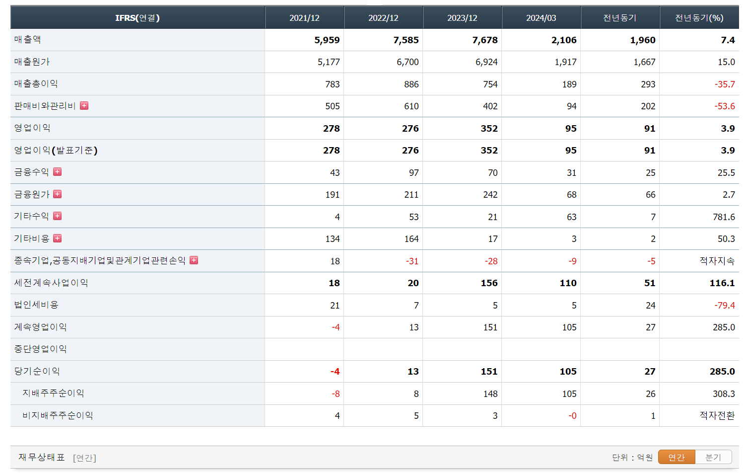 2024년 1분기, 다날은 매출이 소폭 감소했으나 영업이익은 증가하고 순이익 적자폭이 크게 개선되었습니다. 휴대폰 결제 시장에서의 강력한 입지와 콘텐츠 네트워크는 꾸준한 성장을 뒷받침할 요소입니다.