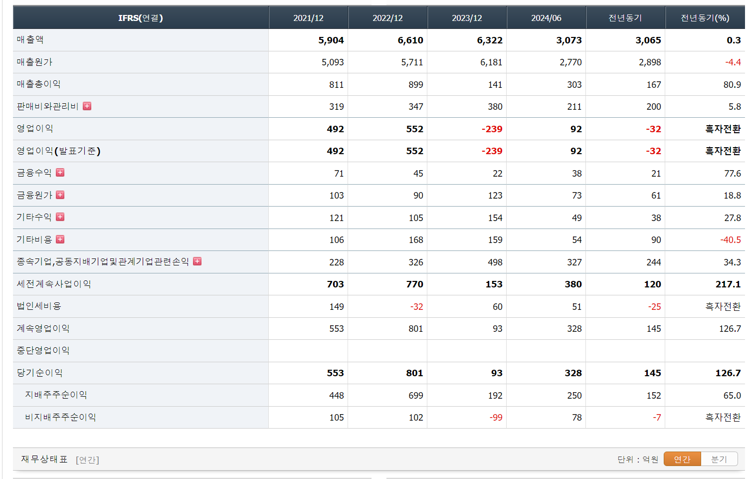 | 2024년 2분기 | 3,073억 원 (전년 대비 0.25% 증가) | 91억 원 (전년 대비 흑자 전환) | 328억 원 (전년 대비 126% 증가) |