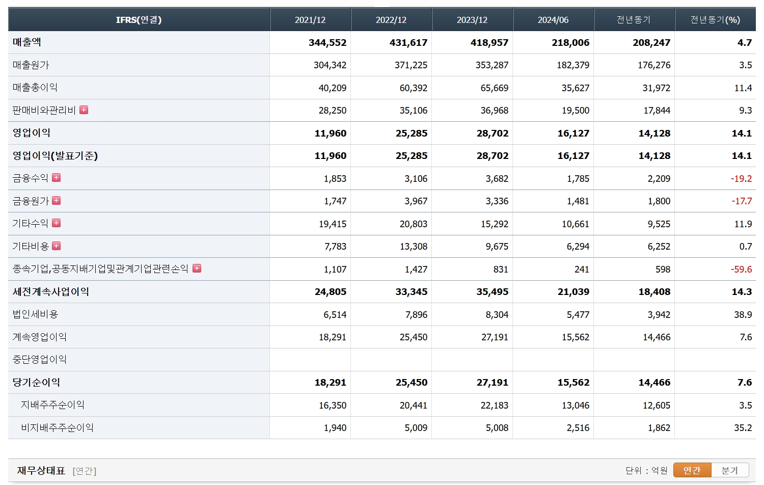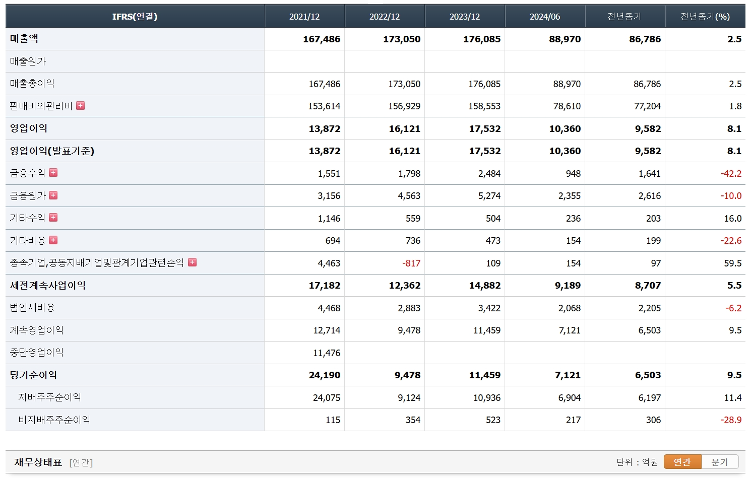 - 당기순이익: 1조 2,000억 원 (전년 대비 +7%)